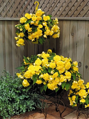 Бегония Ампельная желтая — клубневое растение со свисающими побегами, длиной 30 см. Красивы ее зеленые заостренные листья с неровно зубчатыми краями, прекрасны и махровые и полумахровые цветки желтой окраски, диаметром 6–8 см.