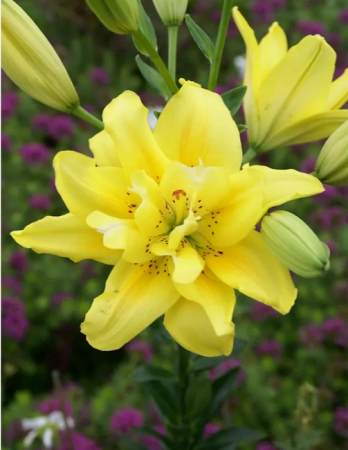 Лилия имеет прочный темно-зеленый стебель. Побеги одиночны и всегда крепки. Отмечают коричневатые полосы, идущие продольно. Тогда побеги приобретают простой бурый цвет. Листья крупные, гладкие и сильно блестят. Они всегда удлинены и имеют простой зеленый цвет. Размер цветка составляет примерно 20 см в диаметре. Ориентирован он вверх и в сторону. Окрашен цветок в яркий желтый цвет. Глаз окрашен в желто-зеленый тон, крапа и каймы нет. Лепестки немного гофрированы, они слегка закручены назад. Дополнительно стоит отметить большую длину тычинок и бордовый окрас пыльцы.