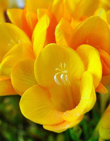 Фрезия Махровая желтая – красивоцветущее клубнелуковичное растение, высотой 30см. Выращивать его можно как в саду, так и дома. Листья имеют поникающую мечевидную форму. Цветки махровые, воронковидные, желтые, диаметром до 6см, собраны в кистевидные соцветия по 10-12шт.