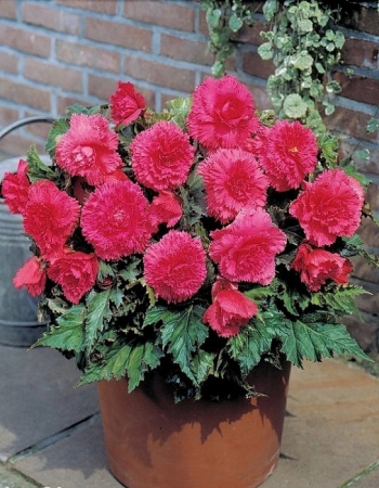Бегония бахромчатая розовая – клубневое растение высотой 20-30см. Красивы ее зеленые сердцеобразные листья с неровно зубчатыми краями, прекрасны и махровые ярко розовые цветки, похожие на гвоздику, диаметром 8-10см.