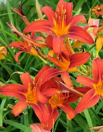 Лилейник Sammy Russell - изящный куст высотой 60 см. Листва узкая, темно-зеленая. Во время цветения выдвигаются высокие цветоносы 70-80 см, несущие очень большое количество бутонов. Цветение пышное, яркое, продолжительное. Цветок звездчатый, диаметром до 10 см, красно-терракотовый, горло оранжевое с темным ореолом. Обладает легким ароматом. Очень заметные и выразительные в саду. Растение цветет ежегодно.
