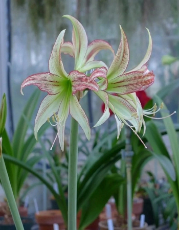 Амариллис простой Эмеральд кажется сделанным из зеленоватого фарфора, такой он бледный. Особый шарм бутону придает узкая бордовая кайма по самому краю лепестков и такого же цвета жилки на верхних долях.Амариллис Эмеральд любит находится в солнечных местах, где нет сквозняков. Земля в горшках должна быть увлажненно-питательная.