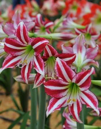 Амариллис Сантьяго-выпускает до 6 необычайно ярких цветков из цветочной стрелки. Контрастный узор из белых и клюквнно-вишневых полос на зауженных лепестках так и влечет, заставляя рассмотреть цветки ближе.Цветы амариллиса Сантьяго обладают нежным ароматом. Луковица формирует за сезон до 3 цветочных стрелок.