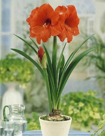 Амариллис Оранж Соверен – луковичное многолетнее комнатное растение, радующее своим цветением в самом начале весны. Одна или две цветочные стрелки, которые образуют луковицы амариллиса, несут на себе от 3 до 6 сочно-оранжевых цветков. Высота растения 40-60 см, диаметр цветка 15 - 25 см.