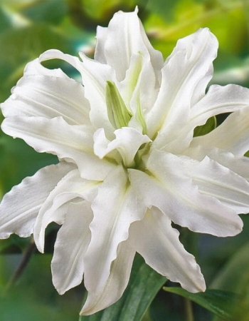 Лилия Полар Стар восточная махровая Период цветения приходится с июля по август, образуя роскошные пышные цветы с нежным сладким ароматом диаметром 15-20 см белоснежного оттенка с нежно-желтым цветом в основании слегка волнистых лепестков. Лепестки нежные трехслойные, слегка закручены, благодаря чему цветок принимает привлекательную и пышную форму. Продолжительность цветения 2-4 недели. Высота растения 100 см. Зимостойкий сорт.