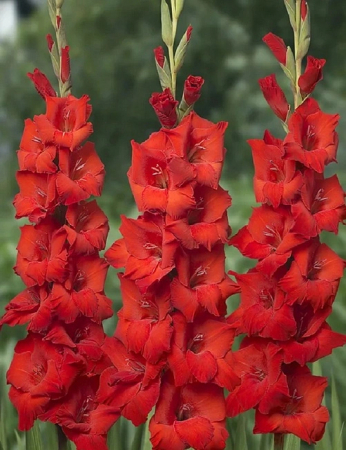 Гладиолус Бонфайр — клубнелуковичное растение высотой 80–110 см. Цветки воронковидные, собраны в колосовидное соцветие до 80 см длиной, лепестков цвета пламени: сочетание красных и оранжевых оттенков.