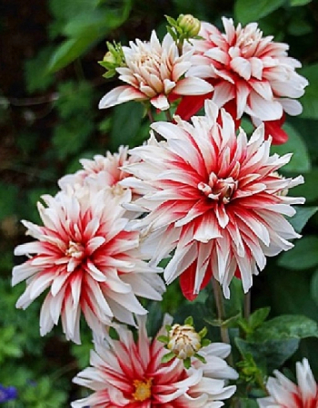 Георгина Кэтчинг Фаер- Яркий биколорный сорт. Белые лепестки с ярко-красными полосами притягивают взгляд. Диаметр цветка 12 см, высота растения 90 см. Дает хорошую срезку. Используется в цветниках, клумбах. Высокая устойчивость к заболеваниям.