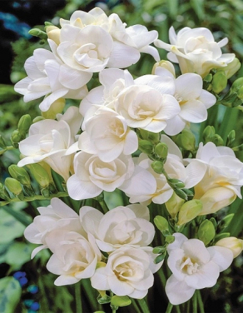Фрезия Махровая белая – красивоцветущее клубнелуковичное растение, высотой 30см. Выращивать его можно как в саду, так и дома. Листья имеют поникающую мечевидную форму. Цветки махровые, воронковидные, белые, диаметром до 6см, собраны в кистевидные соцветия по 10-12шт.