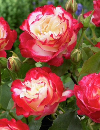 Цветки вначале кремово-белые, с красным только на внешних лепестках, но по мере распускания малиновая окраска расширяется, особенно в жаркую погоду. Цветки очень крупные, появляются обычно по одному, редко по 2-3, на длинных, жестких, колючих побегах. Аромат очень сильный, сладкий, фруктовый. Размер цветка 13-14 см. Высота 90-150 см. Ширина 60-150 см