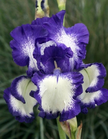 Ирис Степпинг Аут – корневищное растение высотой 80-100см. Мечевидные листья с восковым налетом собраны в вееровидные пучки. Цветки белые с фиолетовыми краями, размером 10-15см, источают сладковатый тонкий аромат. Цветет с июня по июль. Используется для всех типов ландшафтного дизайна (украшение клумб, бордюров, рабаток). Прекрасно смотрится в срезке.