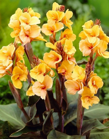 Канна Луис Коттон - многолетнее травянистое растение с прямыми стеблями и мясистыми клубневидными корневищами высотой 60см. Листья крупные, мощные, зеленые с коричневым отливом. Соцветие - кисть, которая начинает цвести с нижнего цветка, потом постепенно поднимается вверх над кустом. Цветки желто-оранжевые диаметром до 12см. Канны декоративно выглядят в больших групповых посадках. На клумбах их располагают в центре. Хороши также канны летом на балконах и террасах.