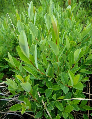 Ива черничная - редкий вид, низкий прямостоящий кустарник, высота 30—80 см. Крона рыхлая с восходящими ветвями пурпурного цвета. Листочки округлые, гладкие, похожие на листья черники.