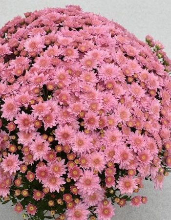 Эффектная шаровидная хризантема – плотный компактный и низкорослый цветущий «шар» густо усыпанный розовыми цветками. Побеги голые, невысокие, достигающие максимум 40 см. Куст не нуждается в формирующей обрезке, так как его форма закреплена на генетическом уровне.