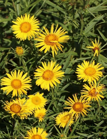 Девясил мечелистный: низкое, 15 - 30 см высотой, компактное растение с многочисленными тонкими прочными стеблями, слабоветвистыми в верхней части.