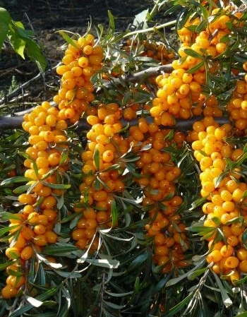 Облепиховый куст невысокий (до 2,5 м), компактный, ветви с редкими шипами.В середине августа созревает урожай 10-12 кг с куста.