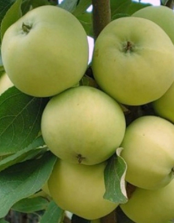 Плоды средние по размерам, с возрастом мельчают, обычно весят 80-100 граммов и до 180 при интенсивном уходе. Яблоки заметно ребристые, иногда даже бывают трехгранными, имеют выраженный тонкий шов. По окрасу яблоки зеленовато-желтые, без румянца. Кожица тонкая и нежная, мякоть рыхлая, крупнозернистая. Вкус очень нежный, сочный, освежающий, заметно кисловатый.