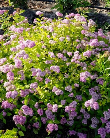 Цветы: нежно- розово-красные, мелкие, диаметром 0,5 см, собраны в щитковидные соцветия на концах ветвей, диаметр соцветия – 3-4 см.Период цветения: июнь – июль, продолжительность цветения – около 45 дней, цветение обильное.