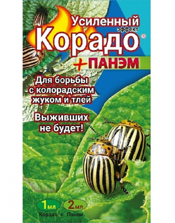Корадо Усиленный эффект (системный препарат) — защищает даже молодой прирост, растущий после опрыскивания. Эффективен и против личинок, и против взрослых жуков. Усиленный эффект достигается благодаря специальному прилипателю «Панэм». Более прочный контакт с листьями и покровами вредителей, большее и лучшее проникновение действующего вещества в организм насекомых и листовые пластины, меньше потерь препарата из-за стекания с листьев и испарения в жаркую погоду.
