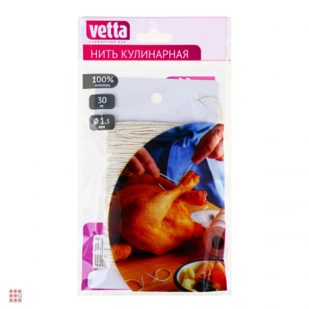 Хлопковая кулинарная нить VETTA длиной 30 м и диаметром 1,5 мм применяется для приготовления мясных рулетов, при копчении, запекании, для связки ног и крыльев куриц. Не токсична, поэтому безопасна для здоровья. Не врезается в мясо, за счет чего отличается практичностью. Нить прочно держит узел, благодаря чему сохраняет форму продукта.