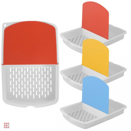 Перекидная разделочная доска имеет в основании поддон, разделенный на 2 секции, одна из которых выполняет функцию лотка для сбора нарезанных продуктов, а вторая используется в качестве дуршлага. Такая оригинальная конструкция изделия позволит вам комплексно решать задачи по обработке ингредиентов для приготовления блюда.