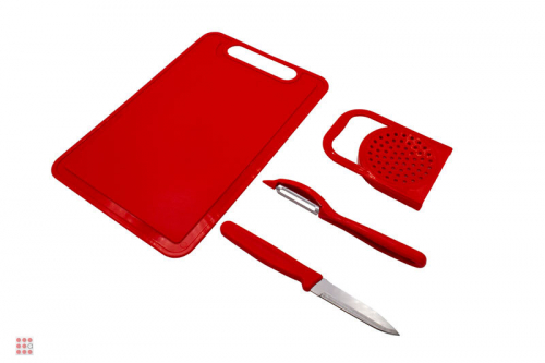 В него входит разделочная доска с бортами. Небольшой нож. Овощечистка классической формы. Крышка для слива с удобной ручкой.