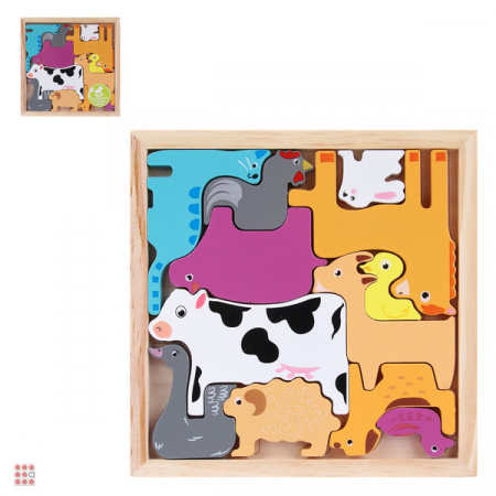 Игрушка представляет собой поле с рамкой и контурами фигур. Задача ребенка – расположить фигуры по указанному шаблону так, чтобы все они уместились в рамку. Забавные фигурки из натурального дерева не имеют заусенцев, гладко обработаны и окрашены в яркие привлекательные цвета, поэтому головоломка непременно привлечет внимание малыша.