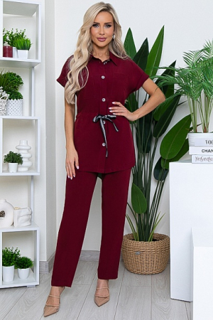Комплект из текстильного полотна.Жакет с центральной застежкой,воротник отложной на стойке,по талии кулиска с поясом из декоративной тесьмы.Рукав цельнокроеный с манжетом по низу.По бокам разрезы.Брюки прямого силуэта без застежки,с имитацией гульфика по переду.с функциональными карманами по бокам и эластичной резиной по поясу.