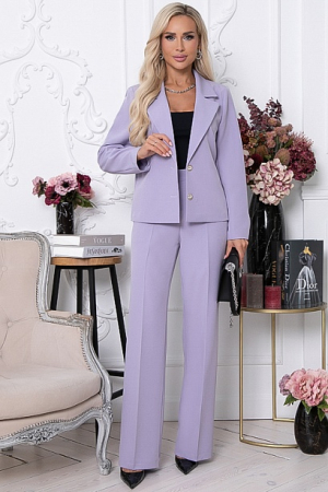 Комплект брючный из костюмной ткани.Жакет прямого силуэта с отложным воротником с лацканами.Рукав втачной длинный.Застежка на две пуговицы.Брюки прямые,свободные с заутюженными стрелками,по бокам функциональные карманы.Пояс притачной с эластичной резиной по спинке.В среднем шве переда имитация гульфика.