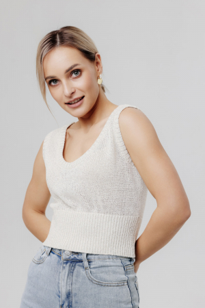 Топ укороченный 95% лен, 5% серебряный люрекс, силуэт прямой.