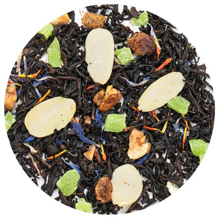 Чай черный индийский, кусочки груши, цукаты ананаса, лепестки миндаля, лепестки сафлора, лепестки василька, аромат восточного сада