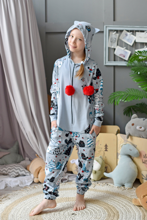 Комбинезон детский на молнии из набивного трикотажного полотна, с капюшоном, стилизованный в виде животного - леопарда, с двумя боковыми карманами в швах. Рукава длинные втачные на манжетах. На капюшоне принт-«мордочка леопарда», шнурок.