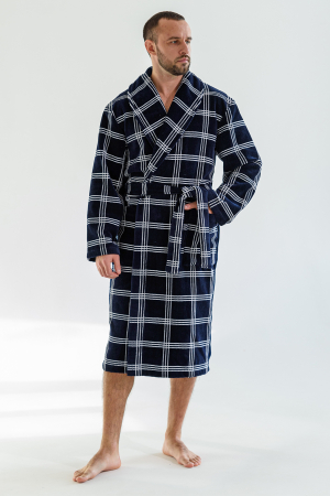 Классический домашний мужской халат изготовлен из плотной х/б двухсторонней махровой ткани, с рисунком «клетка». Запашной халат прямого силуэта, базового покроя с втачными руками, воротником – «Шаль», накладными карманами и навесным поясом, длиной ниже колена.