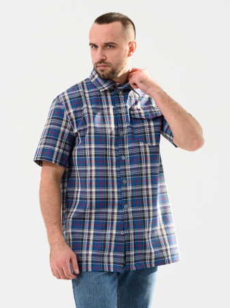 Сорочка верхняя мужская полуприлегающего силуэта с застежкой на пуговицы и одним накладным карманом. Рукав втачной, короткий. Воротник отложной на стойке.