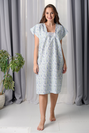 Сорочка женская свободного силуэта из ситца длиной ниже колена с отрезными кокетками полочки и спинки, и цельнокроеным рукавом. На полочке вставка из кружева. Вырез горловины полочки и спинки окантован. Низ рукава и низ изделия обработаны швом в подгибку.