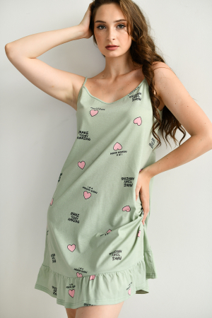 Сорочка женская хлопчатобумажного полотна. Изделие полуприлегающего А -силуэта, длиной немного выше линии колена. Тонкие бретели сорочки и притачной волан по низу изделия, создают волшебный лёгкий и романтичный образ.