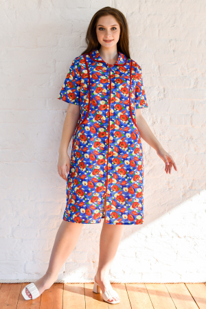 Халат женский с застёжкой на тесьму-молнию. Полочка с рельефами из плечевых швов и двумя накладными боковыми карма-нами. Воротник отложной. Рукав короткий, втачной. Низ изделия обработан швом в подгибку.