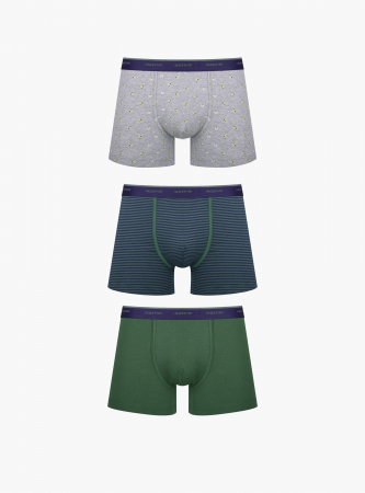 Набор включает в себя трое мужских боксеров, изготовленных из хлопка. Двое трусов выполнены в классических сером и зеленом цветах и одни трусы в зеленую полоску. Каждые из трусов в наборе имеют резинку на талии, обеспечивающая комфортную посадку без давления.