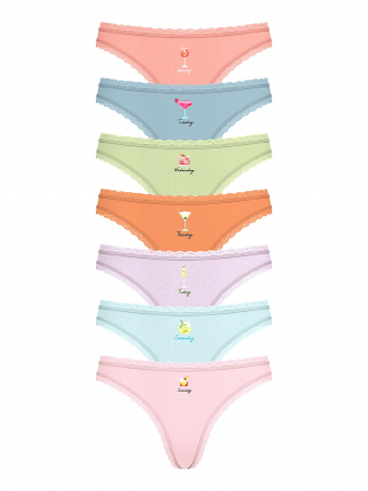 Indulge in a pair of cute Panties that celebrates each day of the week. Trimmed in lace, these Thongs are made in a soft cotton-modal blend.