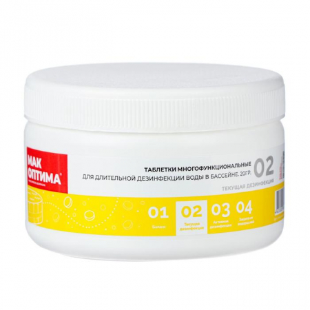 Описание: многофункциональный комплексный препарат, и он является отличным вариантом для обработки воды плавательного бассейна. Он дезинфицирует воду на высоком уровне, медленно растворяется из-за этого, тщательно убирает и разрушает все бактерии разного вида и наросты водорослей, имеет свойство очищать цвет воды и убирает ее мутность.