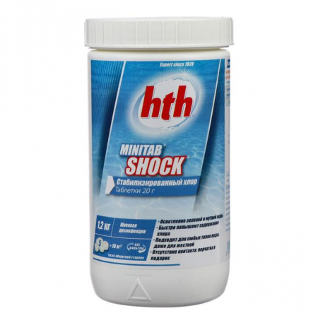 Быстрый стабилизированный хлор в таблетках по 20 гр. hth Minitab Shock 1,2 кг - таблетки стабилизированного хлора, предназначенные для использования в бассейнах с песочными фильтрами. Служат для шоковой дезинфекции мутной и зелёной воды а также фильтров в общественных бассейнах.