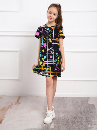 Базовая туника на девочку выполненная из хлопкового полотна пестрой расцветки. Изделие с коротким втачным рукавом и круглой горловиной.