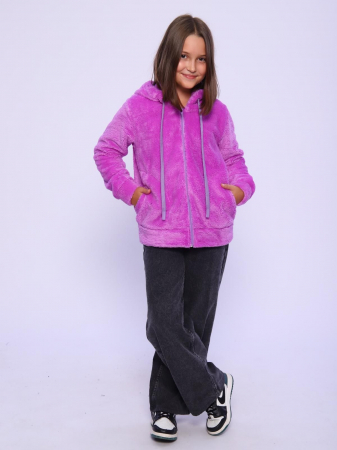 Детская куртка выполнена из полотна "велсофт". Куртка прямого покроя на молнии, с капюшоном, рукав на манжете, низ куртки на поясе, в боковых швах находятся карманы, на шнур капюшона, в качестве декоративного элемента, нашиты бомбошки.
