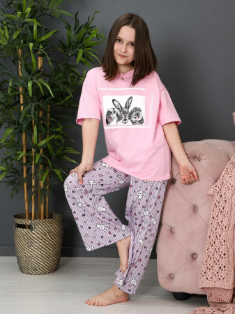 Костюм состоит из футболки оверсайз с печатью и брюк клеш.