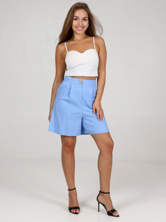 Шорты женские умеренного объёма. Низ шорт обработан подгибкой. На передних половинках шорт глубокие односторонние складки и боковые карманы. Задние половинки шорт с одной талиевой вытачкой. Пояс притачной. Застежка шорт на молнию и петля пуговица.