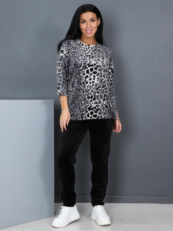 Женский трикотажный костюм состоит из кофты и брюк. Кофта прямого силуэта со спущенной линией плеча. Рукав 3/4. Брюки с карманами в боковых швах, верх на эластичной тесьме.