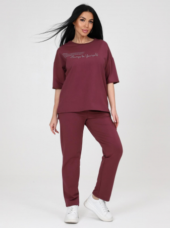 Женский костюм состоит из джемпера и брюк. Брюки длинные с карманами в боковых швах. Джемпер прямого силуэта со спущенной линией плеча. Рукав короткий с отворотиками. Круглый вырез горловины обработан планкой из эластичной ткани.