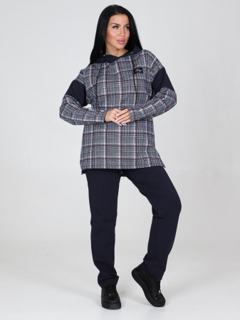 Женский трикотажный костюм состоит из кофты и брюк. Кофта свободного силуэта, комбинированная, с разрезами в боковых швах. Капюшон на люверсах с декоративным шнуром. Брюки с карманами в боковых швах, верх на поясе с эластичной тесьмой.