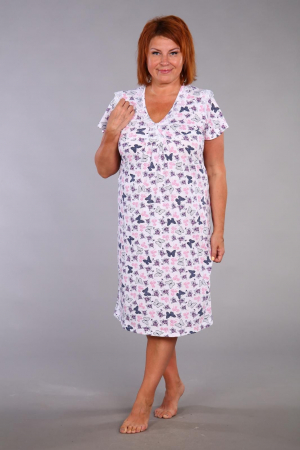 Сорочка ночная женская из кулирки. Полочка с отрезными кокетками на запах. По срезу притачивания кокеток небольшая сборка со стороны полочки. По верхней части пройм и кокеткам спереди располагается кружево. Рукав отрезной. Спинка прямая.