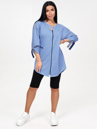 Туника прямого силуэта из ткани в полоску на молнии. Горловина округлой формы. Низ изделия оформлен плавной кривой линией. Рукав изделия длиной ?. Снизу на рукаве расположен люверс и отделочная тесьма, с помощью которых можно регулировать длину рукава. Продольная полоска зрительно вытягивает женскую фигуру, придавая стройность.
