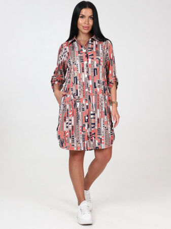 Туника прямого покроя с застёжкой на пуговицы с отложным воротником, в боковых швах карманы. Рукав втачной 3/4. Фигурный низ изделия и рукава декорированы патами на пуговицах.